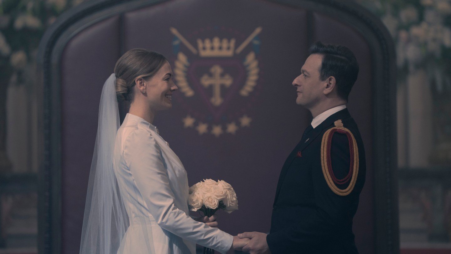 Serena Joy (Yvonne Strahovski) with now-husband High Commander Wharton (Josh Charles) is surprised to be greeted by a handmaid (Allana Reoch) on her wedding night.